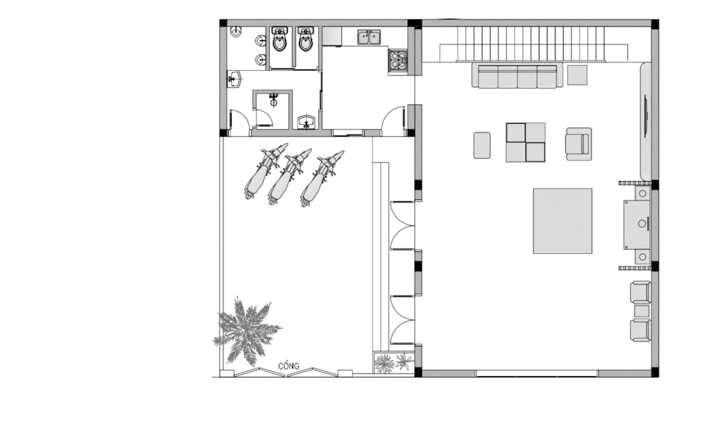 + Tầng 1: Phòng khách và thờ + Phòng ăn + Bếp + WC