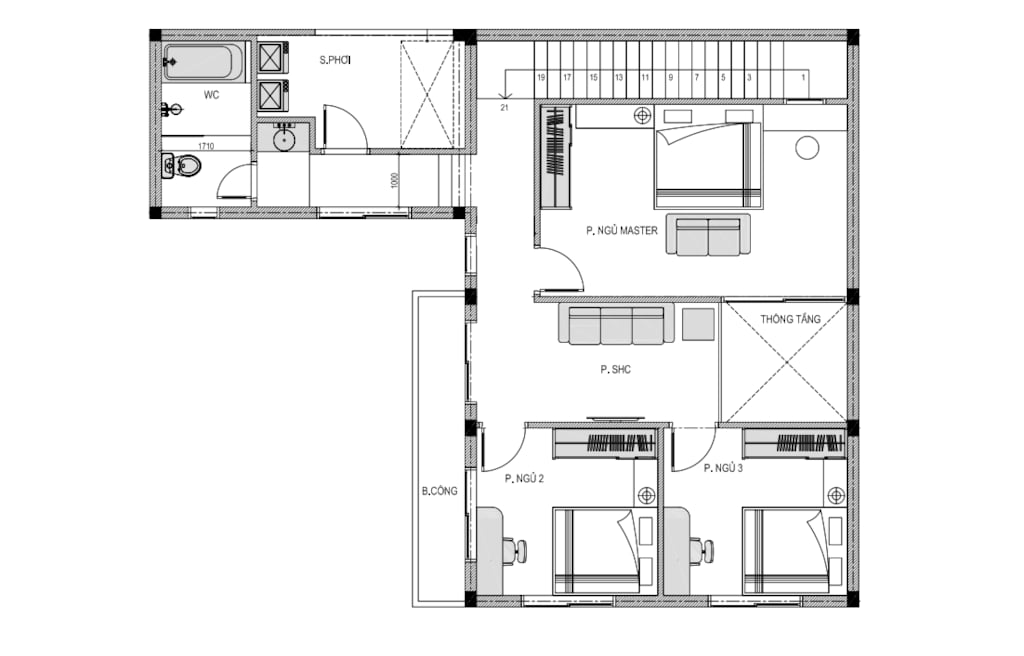 + Tầng 2: Phòng SHC + 1 Phòng ngủ master + 2 Phòng ngủ + WC
