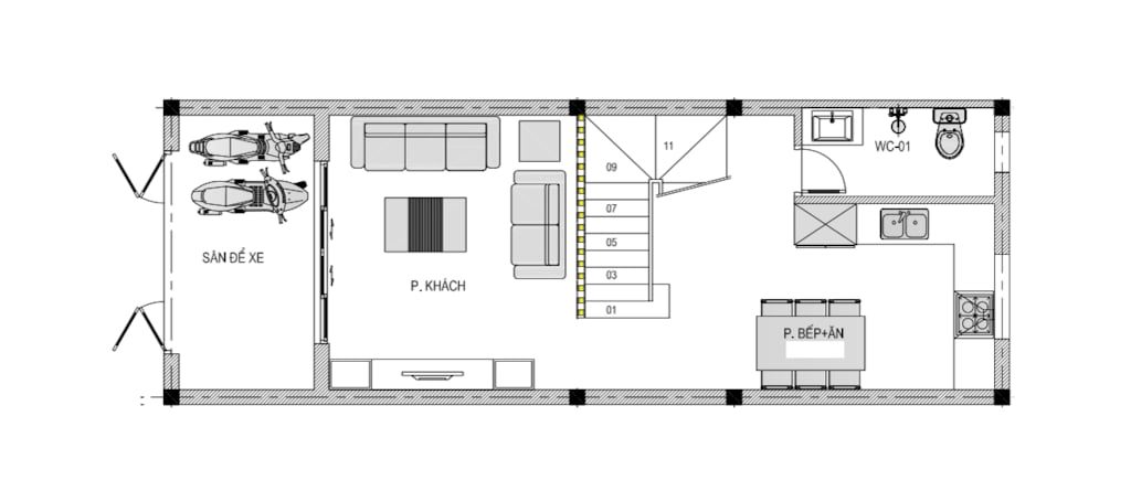 Tầng 1: Sân để xe + Phòng khách + Phòng bếp + WC