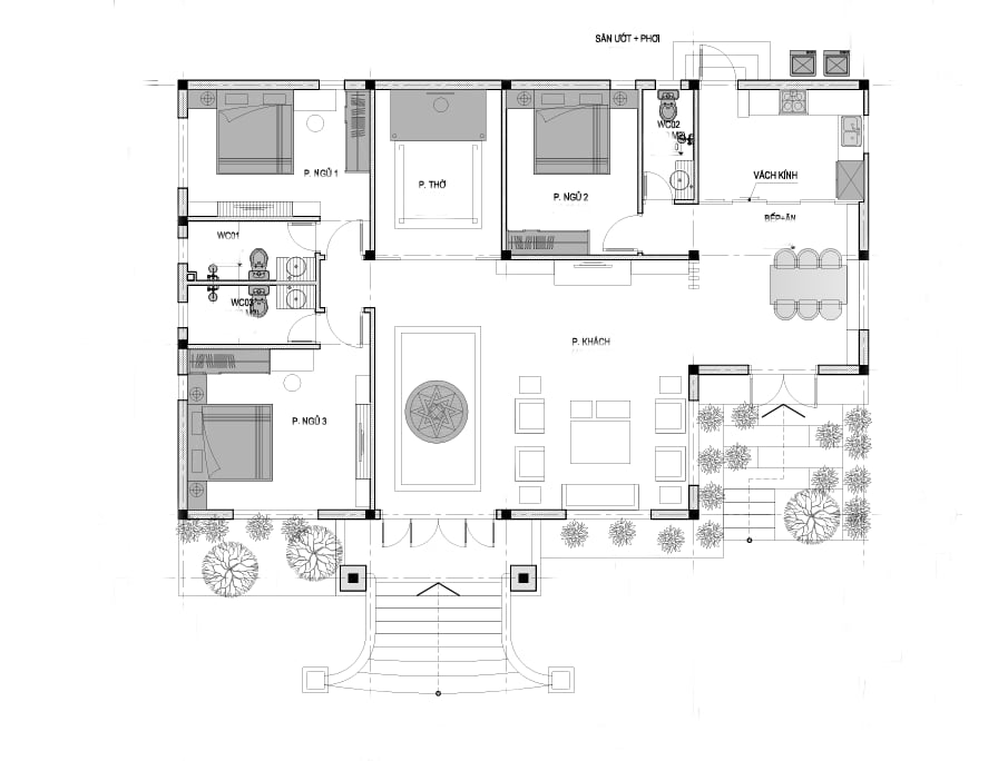 - Công năng: Phòng Thờ + Phòng khách + Bếp + 2 Phòng ngủ khép kín + 1 phòng ngủ thường + 1 WC