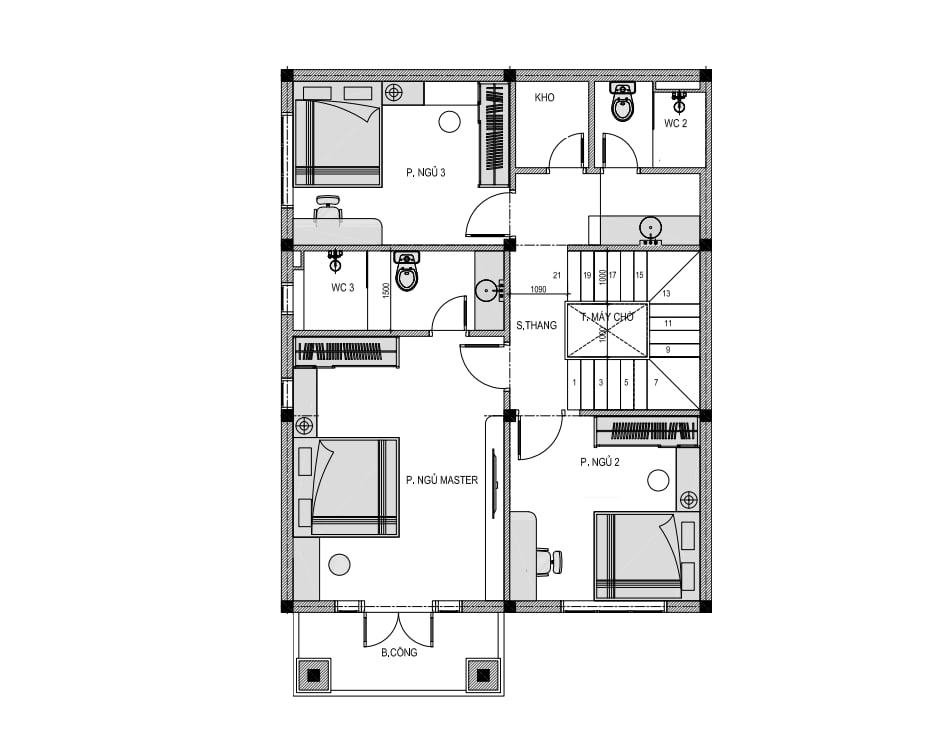 1 Phòng ngủ Master + 2 Phòng ngủ thường + WC + Sân phơi
