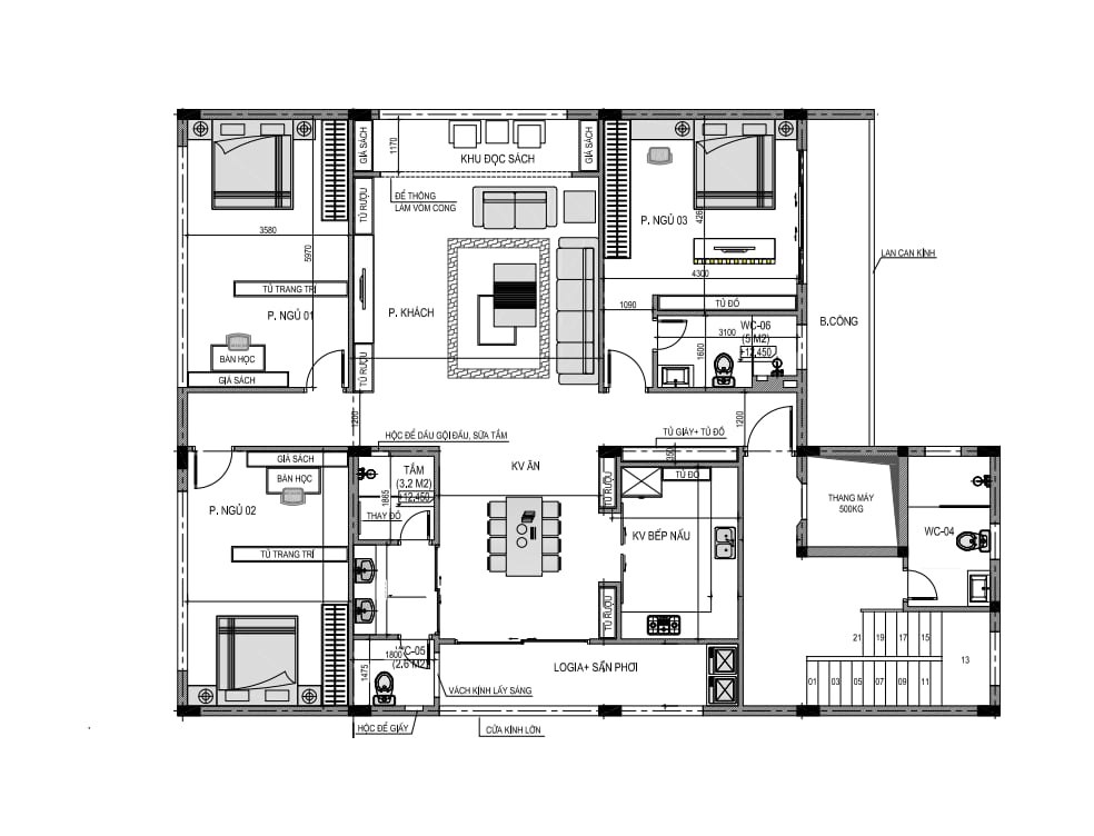 + Tầng 4: Phòng khách + Phòng bếp ăn + 2 Phòng ngủ khép kín + 1 Phòng ngủ thường + WC