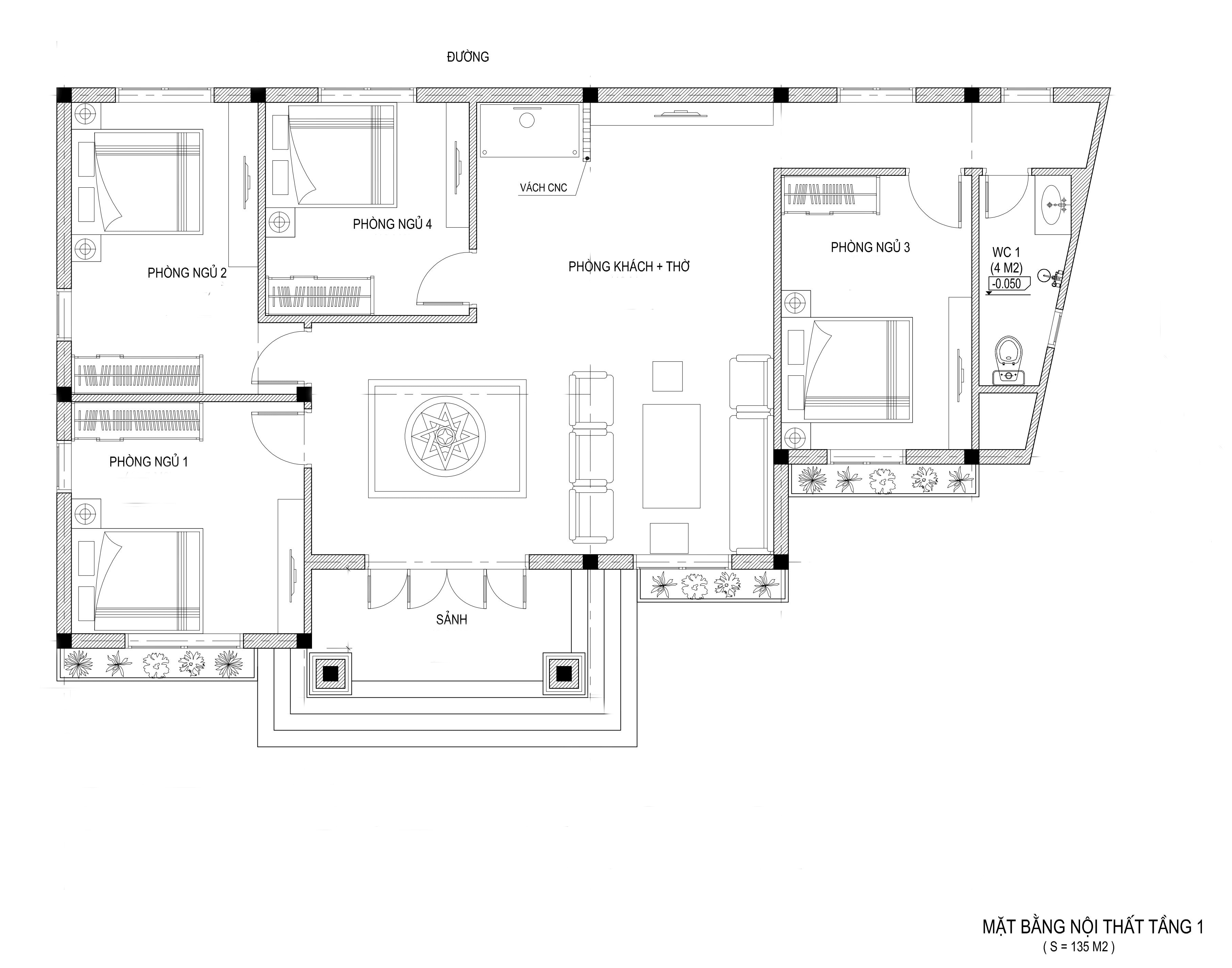 Phòng khách + Phòng thờ + 4 Phòng ngủ + 1 WC.