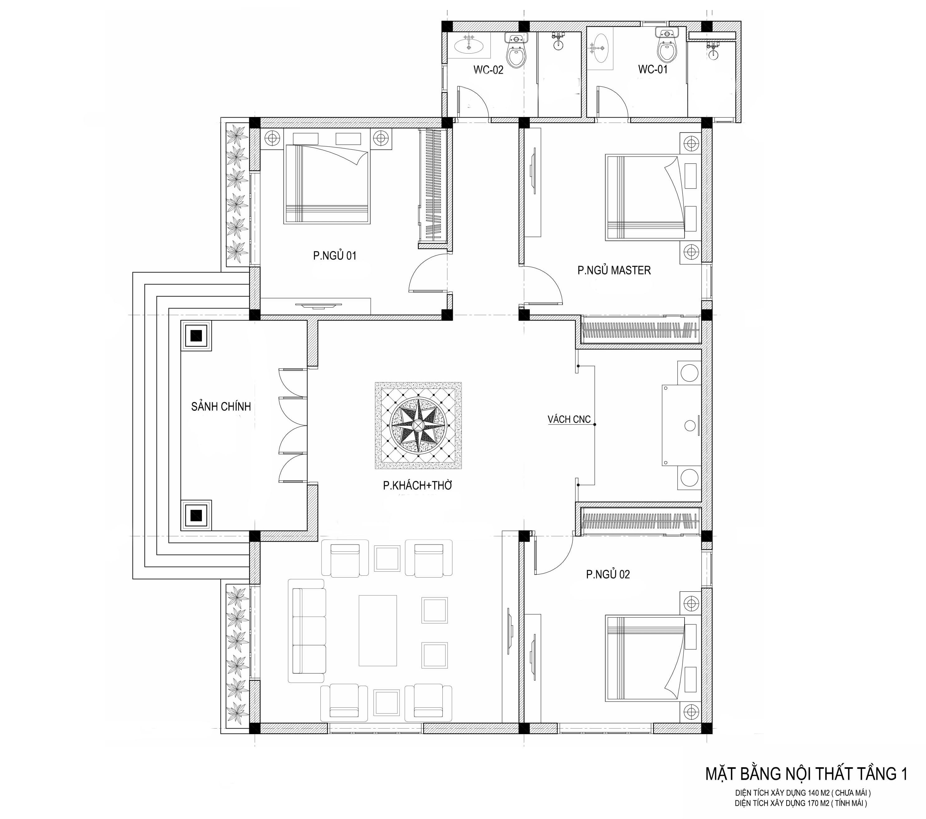 Phòng khách + Phòng thờ + 1 Phòng ngủ Master khép kín + 2 Phòng ngủ thường + 1 WC