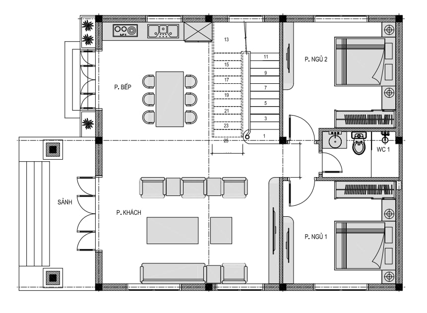 + Tầng 1: Phòng khách + Phòng bếp ăn + 2 Phòng ngủ + 1 WC