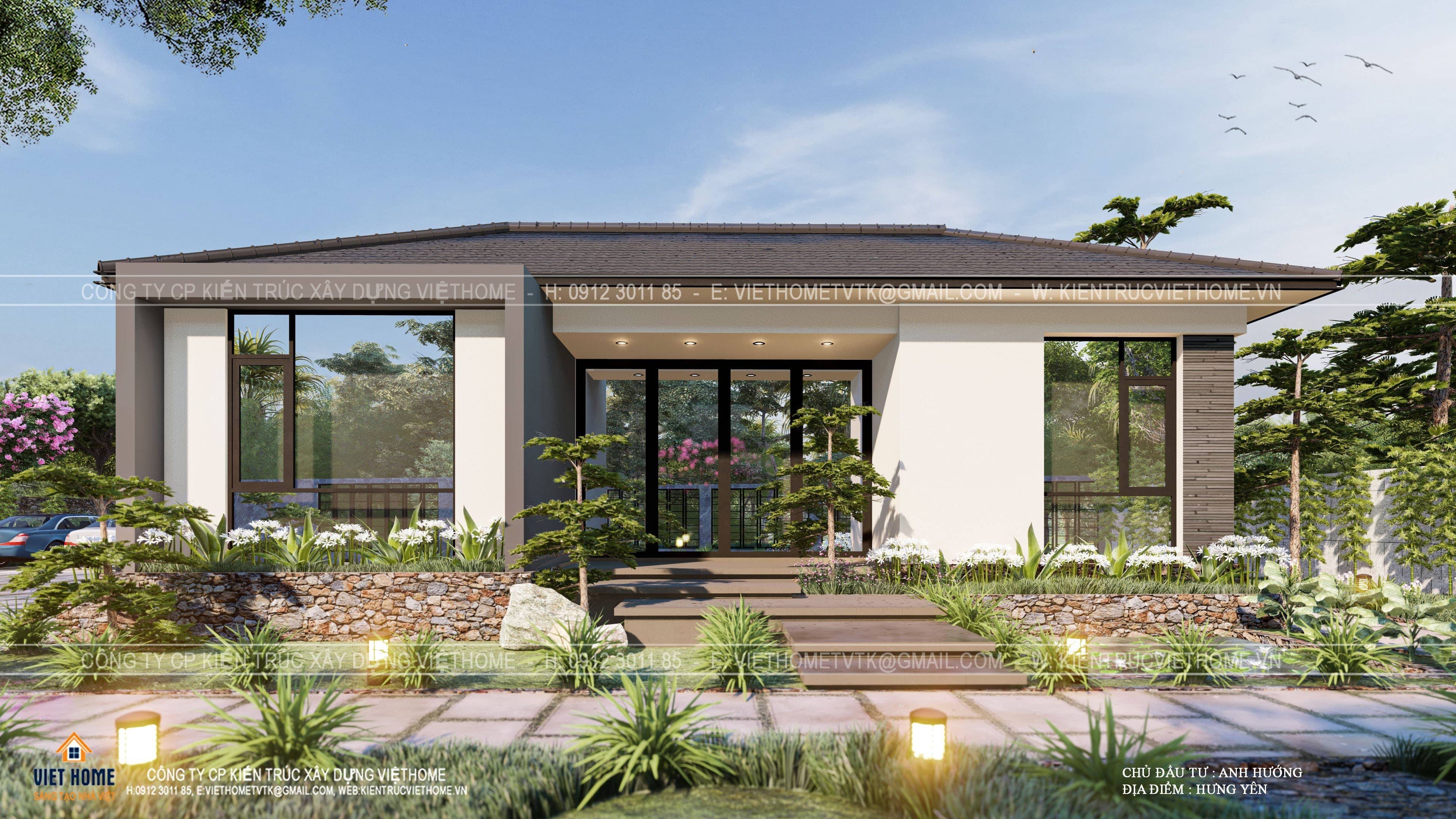 Hiểu được tâm lý khách hàng, KTS Việt Home đã lên ý tưởng thiết kế căn biệt thự sân vườn mái Nhật chữ U phía trước sẽ là không gian sinh hoạt chung, phía sau sẽ là không gian phòng ngủ riêng tư và căn biệt thự được bao quanh bởi sân vườn thoáng mát.