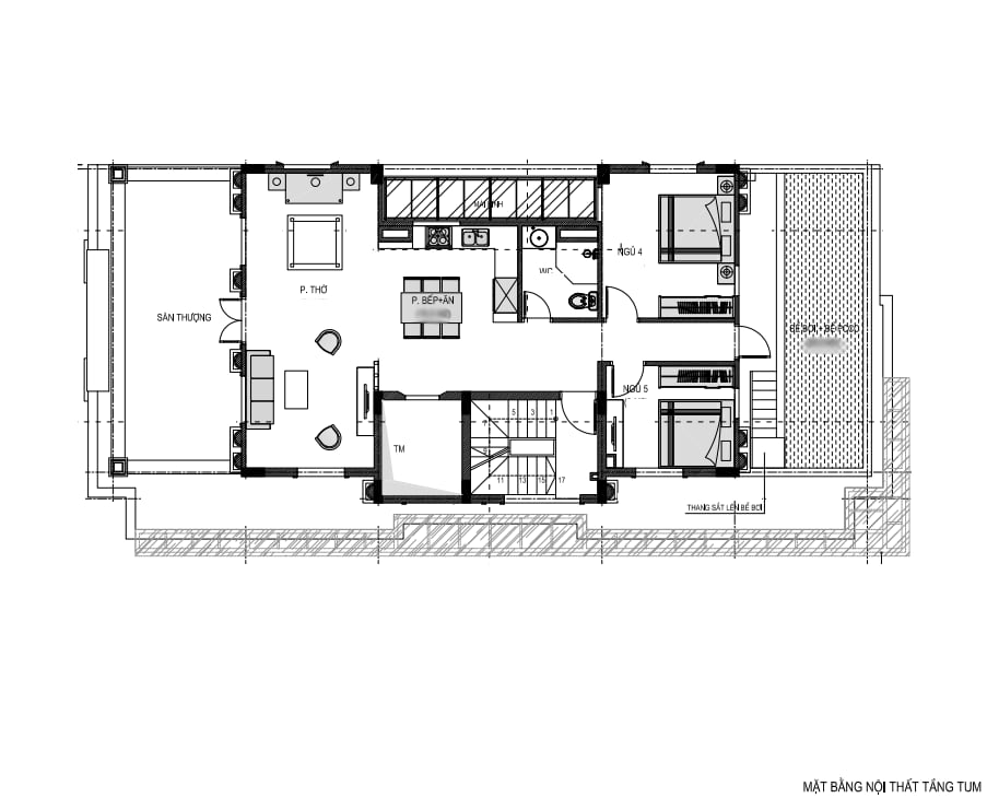 + Tầng 5: 2 Phòng Khách (Bếp Ăn) + 4 Phòng ngủ thường + 2 WC.
