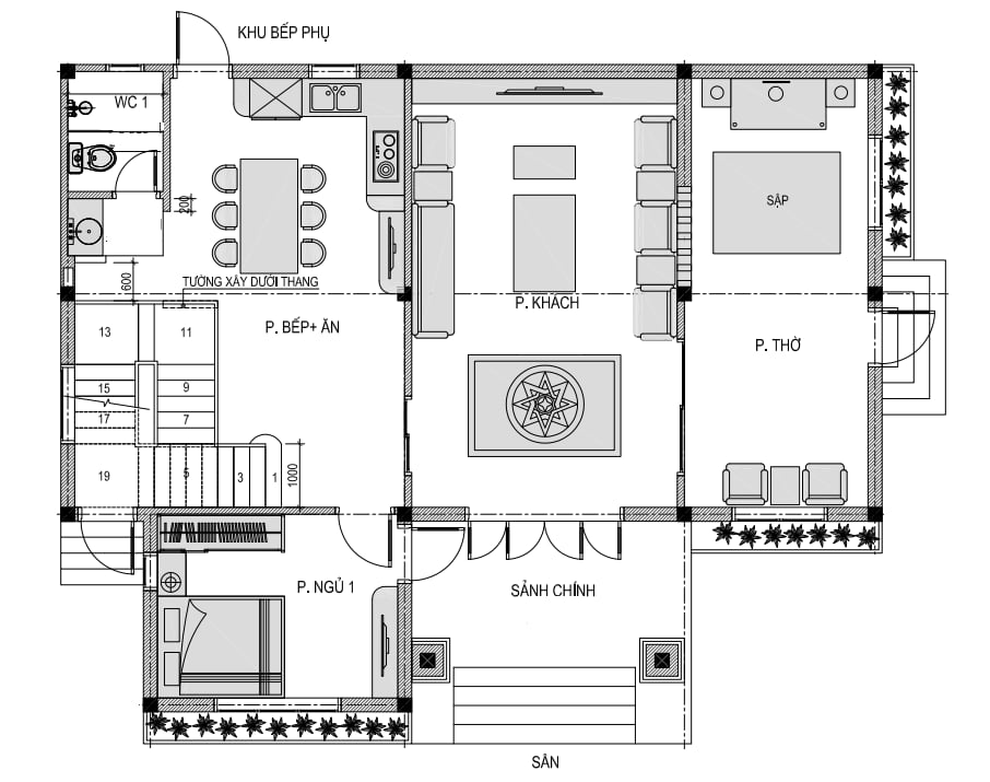 + Tầng 1: Phòng thờ+ Phòng khách + Bếp ăn + 1 Phòng ngủ + 1 WC