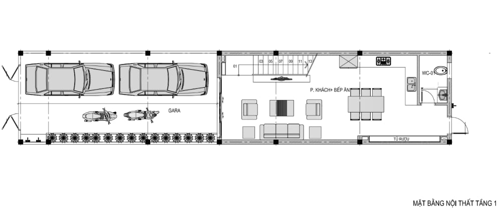 + Tầng 1: Gara + Phòng khách + + Bếp ăn + WC