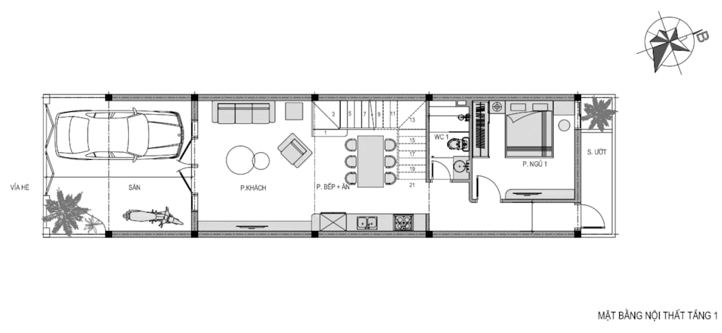 + Tầng 1: Phòng khách , Phòng Bếp + Ăn, 1 Phòng ngủ , 1 WC.