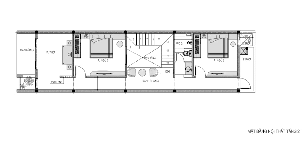 + Tầng 2: Phòng thờ + 2 phòng ngủ + WC + Sân Phơi