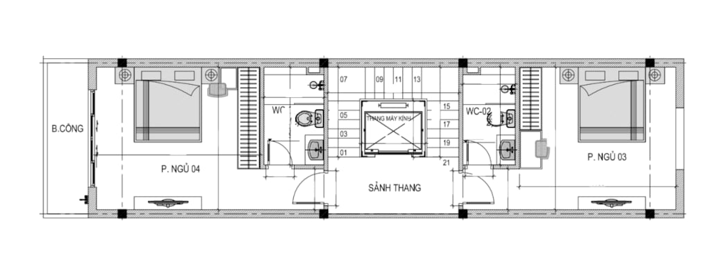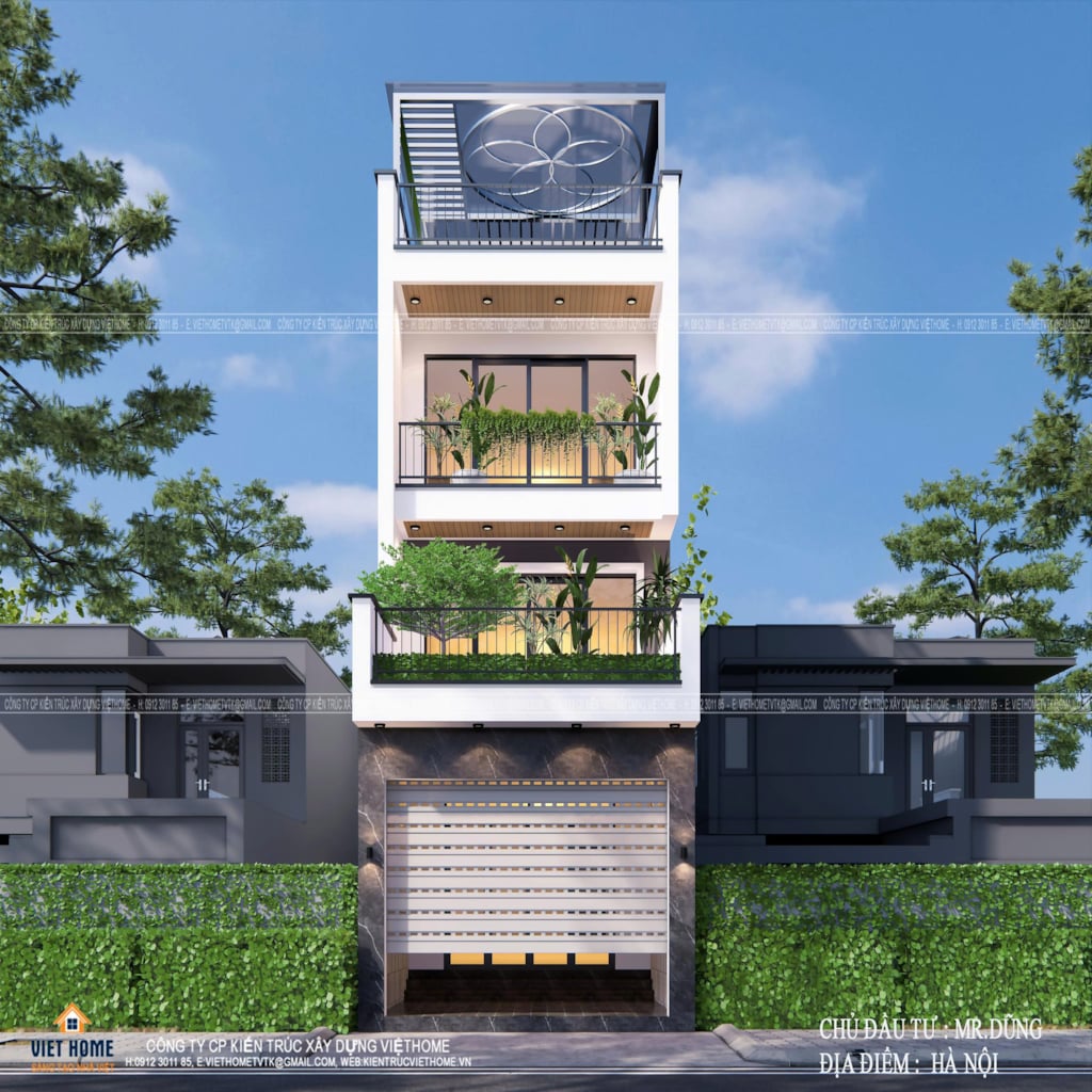 Ban công mỗi tầng được thiết kế rộng rãi, lan can sắt sơn tĩnh điện đen mảnh mai nhưng chắc chắn, tạo sự tương phản thu hút với tông trắng của ngôi nhà. Các bồn cây được bố trí hợp lý: tầng 2 là mảng xanh lớn tạo cảm giác như một khu vườn mini, tầng 3 là hàng cây nhiệt đới giúp thanh lọc không khí, tầng 4 được trang trí thêm cây tán nhỏ làm mềm không gian. Nhờ đó, mặt tiền vừa có sự sắc sảo của kiến trúc hiện đại, vừa có sự dịu dàng của thiên nhiên.