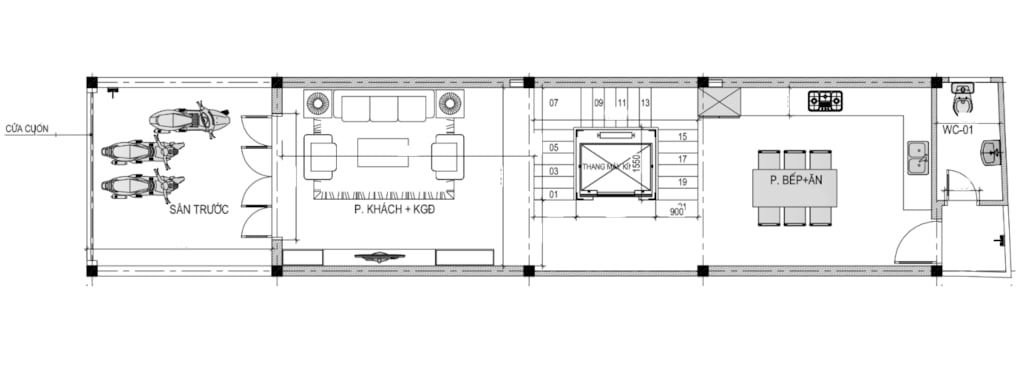 + Tầng 1: Sân trước + Phòng khách, KGĐ + Bếp ăn + WC