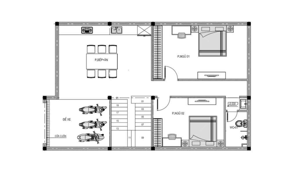 Hầm để xe + Phòng bếp + 2 Phòng ngủ + 1 WC