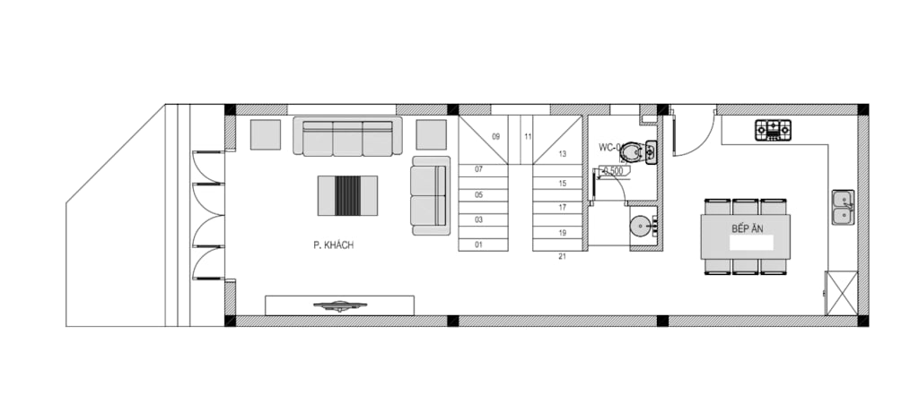 + Tầng 1: Phòng khách + Bếp ăn + WC