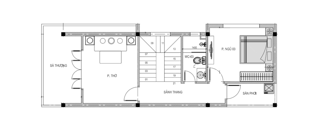 + Tầng 3: Phòng thờ + Phòng ngủ + WC + Sân phơi