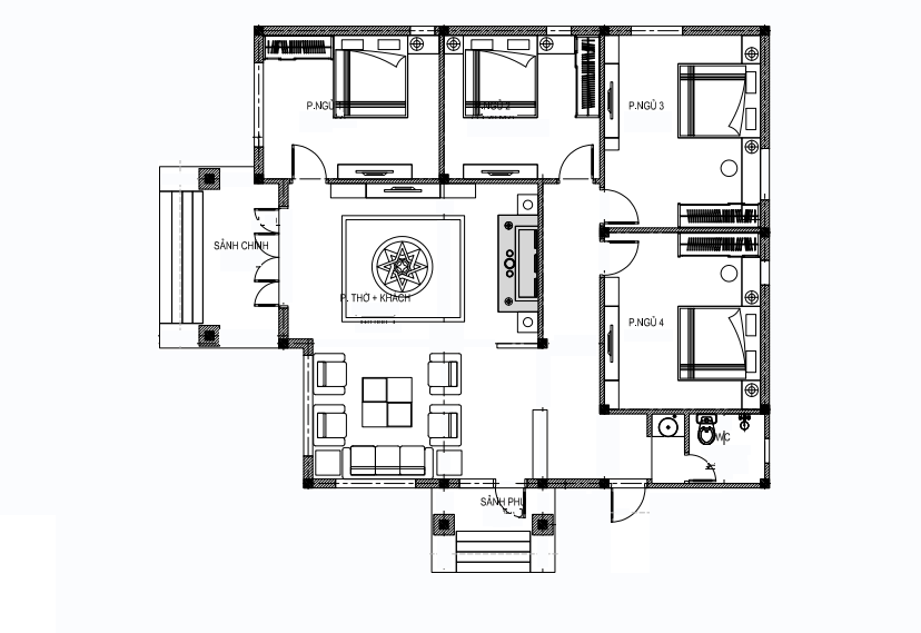 Tầng 1: Phòng Khách + Thờ, 4 Phòng ngủ, 1 WC.