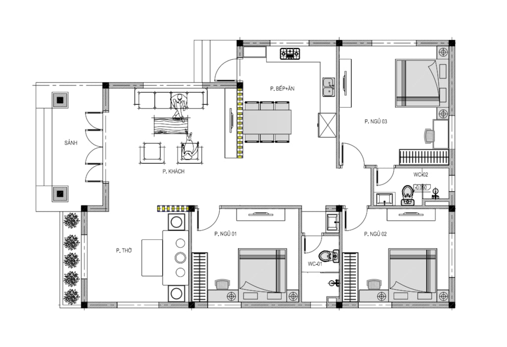 Phòng khách + Phòng thờ + Bếp + 1 Phòng ngủ khép kín + 2 Phòng ngủ thường + 1 WC