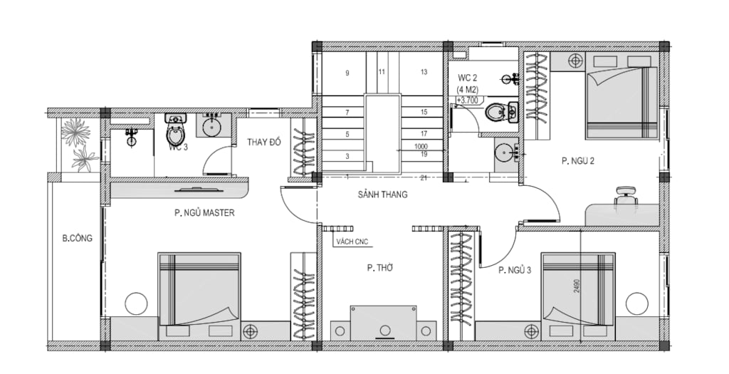Phòng thờ + 1 Phòng ngủ khép kín + 2 phòng ngủ + WC