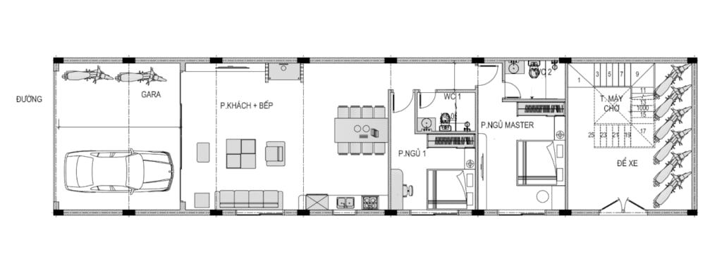 + Tầng 1: Gara + Phòng khách + 1 Phòng ngủ master + 1 Phòng ngủ thường + wc + Để xe cho thuê