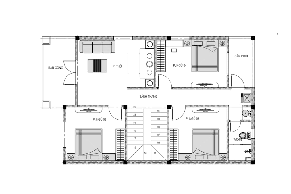 Phòng thờ + 3 Phòng ngủ + 1 WC + Sân phơi