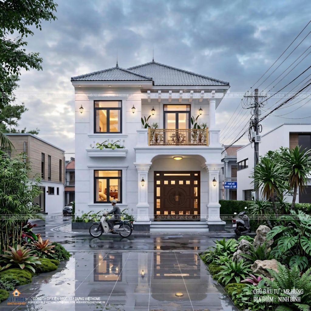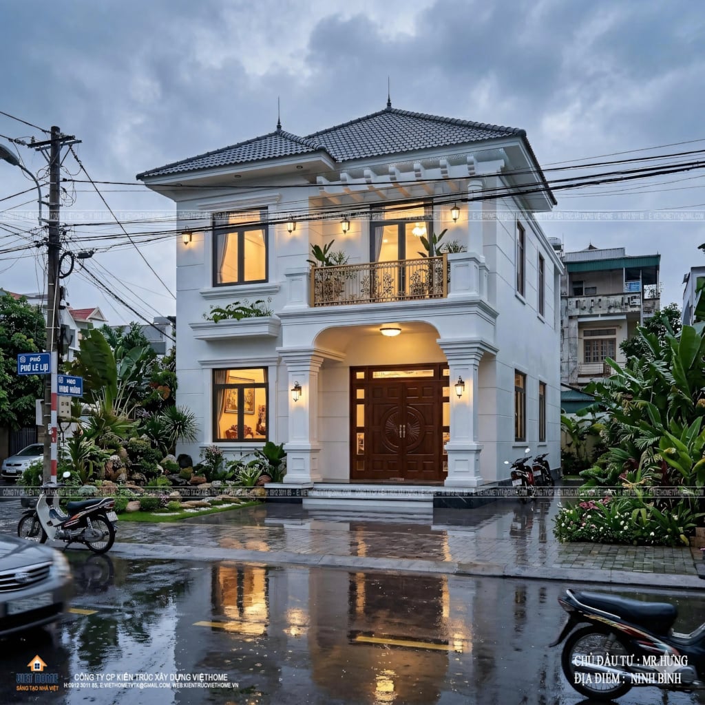 Mẫu nhà 2 tầng mái Nhật của gia đình anh Hưng là sự kết hợp hài hòa giữa vẻ đẹp sang trọng và công năng tối ưu, đang trở thành xu hướng được nhiều gia đình lựa chọn hiện nay. Với gam màu trắng – be chủ đạo, ngôi nhà toát lên sự tinh tế và thanh lịch, nổi bật nhờ thiết kế mặt tiền cân đối cùng hệ cột trụ vững chắc và các chi tiết phào chỉ nhẹ nhàng.