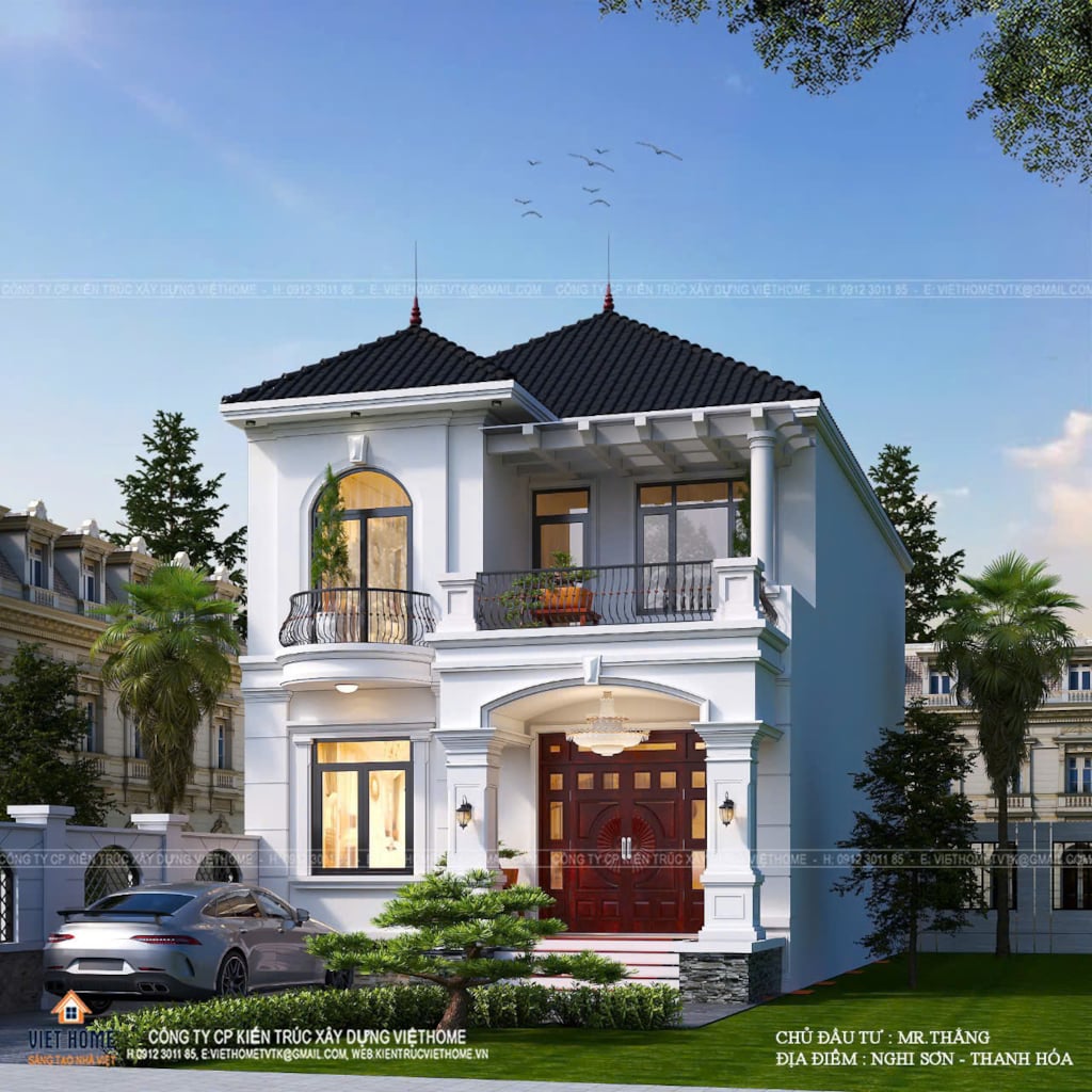 Ban công tầng hai được thiết kế mềm mại với lan can sắt uốn nghệ thuật, điểm xuyết chậu cây xanh tạo nên nét duyên dáng và gần gũi. Phần mái hiên với các thanh lam ngang mang hơi hướng hiện đại, vừa có tác dụng che nắng vừa tạo điểm nhấn kiến trúc độc đáo. Tất cả hòa quyện cùng mảng xanh sân vườn phía trước, tạo nên một tổng thể hài hòa, sang trọng và đầy sức sống, khiến mặt tiền 8m không chỉ rộng rãi mà còn toát lên khí chất của một không gian sống đẳng cấp và tinh tế.
