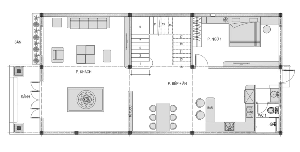 + Tầng 1: Phòng khách + Bếp ăn+ Quầy Bar + Phòng ngủ + 1 WC