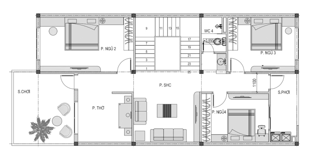 + Tầng 2: Phòng thờ + Phòng SHC+ 3 Phòng ngủ + 1 WC + Sân phơi
