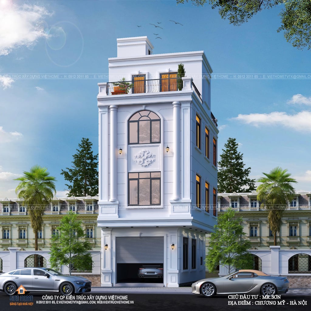 Công trình gây ấn tượng ngay từ cái nhìn đầu tiên với hình khối mạnh mẽ, mặt tiền đối xứng và màu trắng chủ đạo. Thiết kế 3 tầng kết hợp 1 tum giúp tối đa hóa diện tích sử dụng, đồng thời tăng chiều cao, mang lại cảm giác thanh thoát, sang trọng giữa dãy phố.Ngoại thất mẫu nhà 3 tầng 1 tum mang phong cách tân cổ điển nổi bật với tông màu trắng kem chủ đạo, tạo cảm giác sang trọng, thanh thoát và làm nền hoàn hảo để tôn lên hệ phào chỉ tinh tế chạy dọc mặt tiền. Những đường gờ nổi, phào chỉ bo quanh cửa sổ và phù điêu hoa văn đặt giữa tầng 2 được thiết kế sắc nét, mềm mại, thể hiện rõ nét đẹp đặc trưng của kiến trúc châu Âu.
