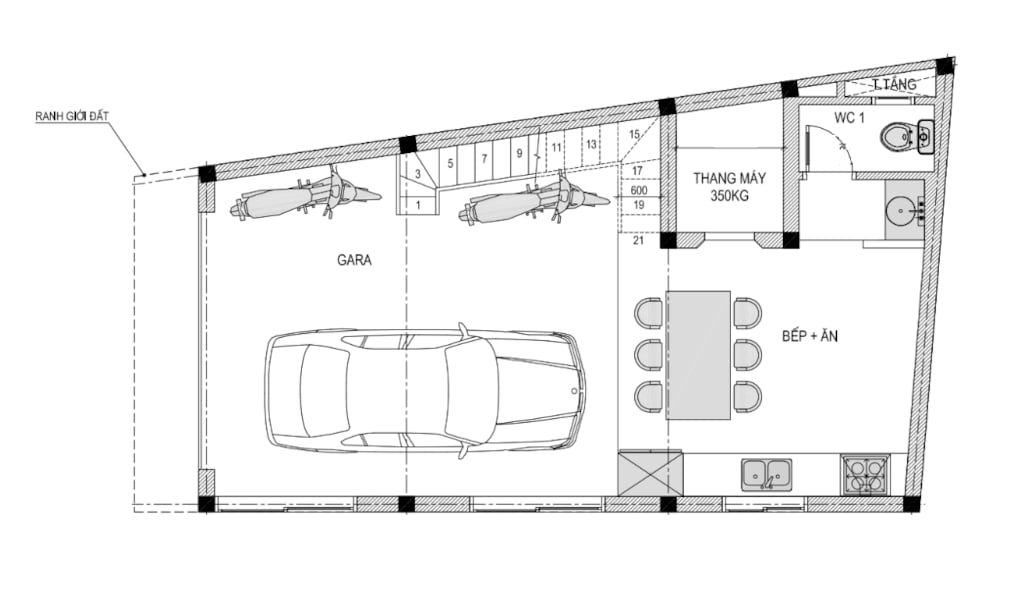+ Tầng 1: Gara + Bếp ăn + 1 WC