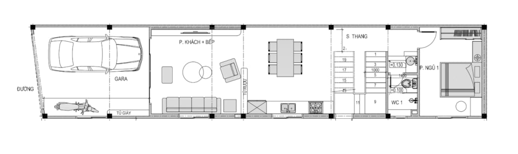 + Tầng 1: Gara + Phòng khách + Phòng Bếp, ăn +Phòng ngủ + WC