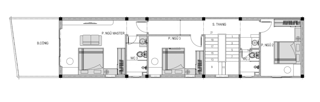 + Tầng 2: Phòng ngủ Master + 2 Phòng ngủ thường + WC