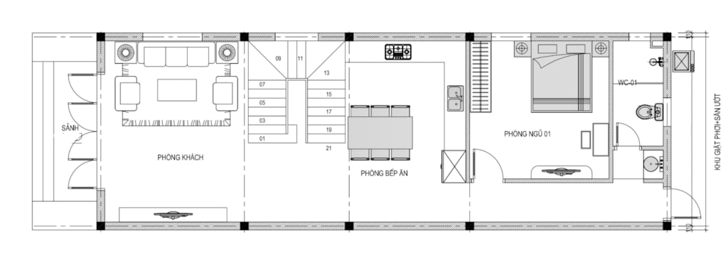 + Tầng 1: Phòng khách + Phòng bếp ăn + Phòng ngủ + wc