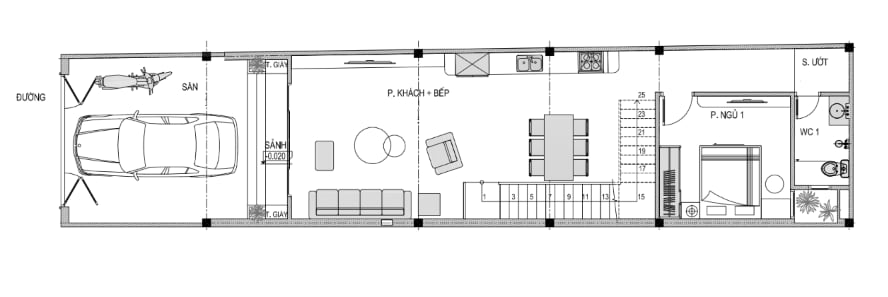 + Tầng 1: Sân+ Phòng khách + Bếp + Phòng ngủ + WC