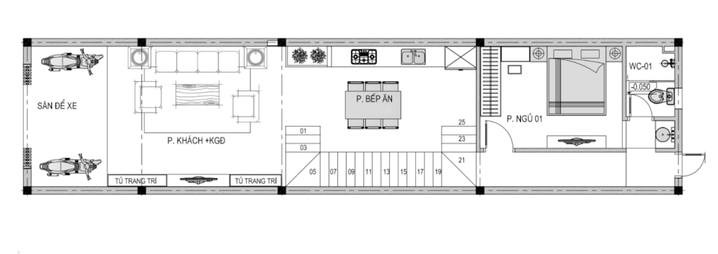+ Tầng 1: Nhà để xe + Phòng khách + Bếp + WC