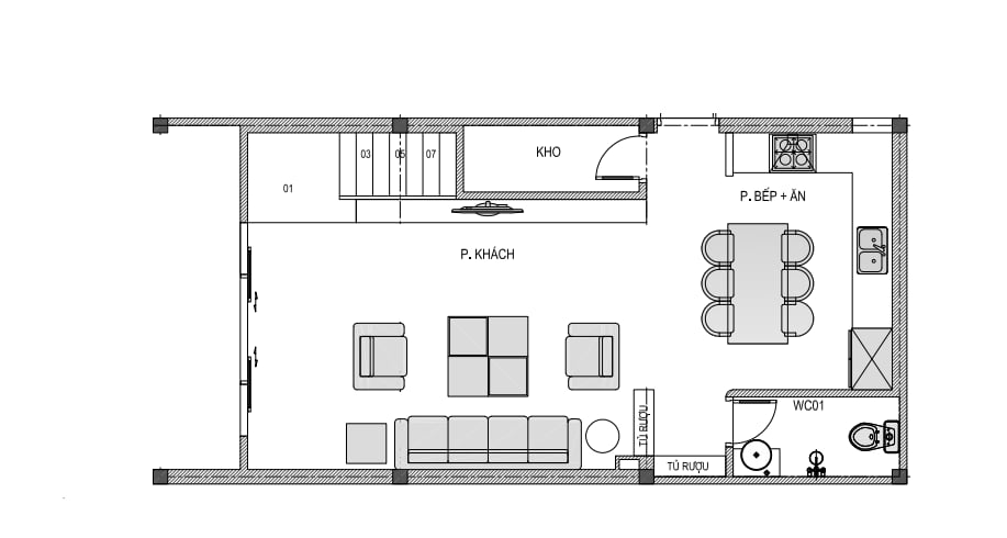 + Tầng 1: Sân để xe + Phòng khách + Phòng bếp + WC