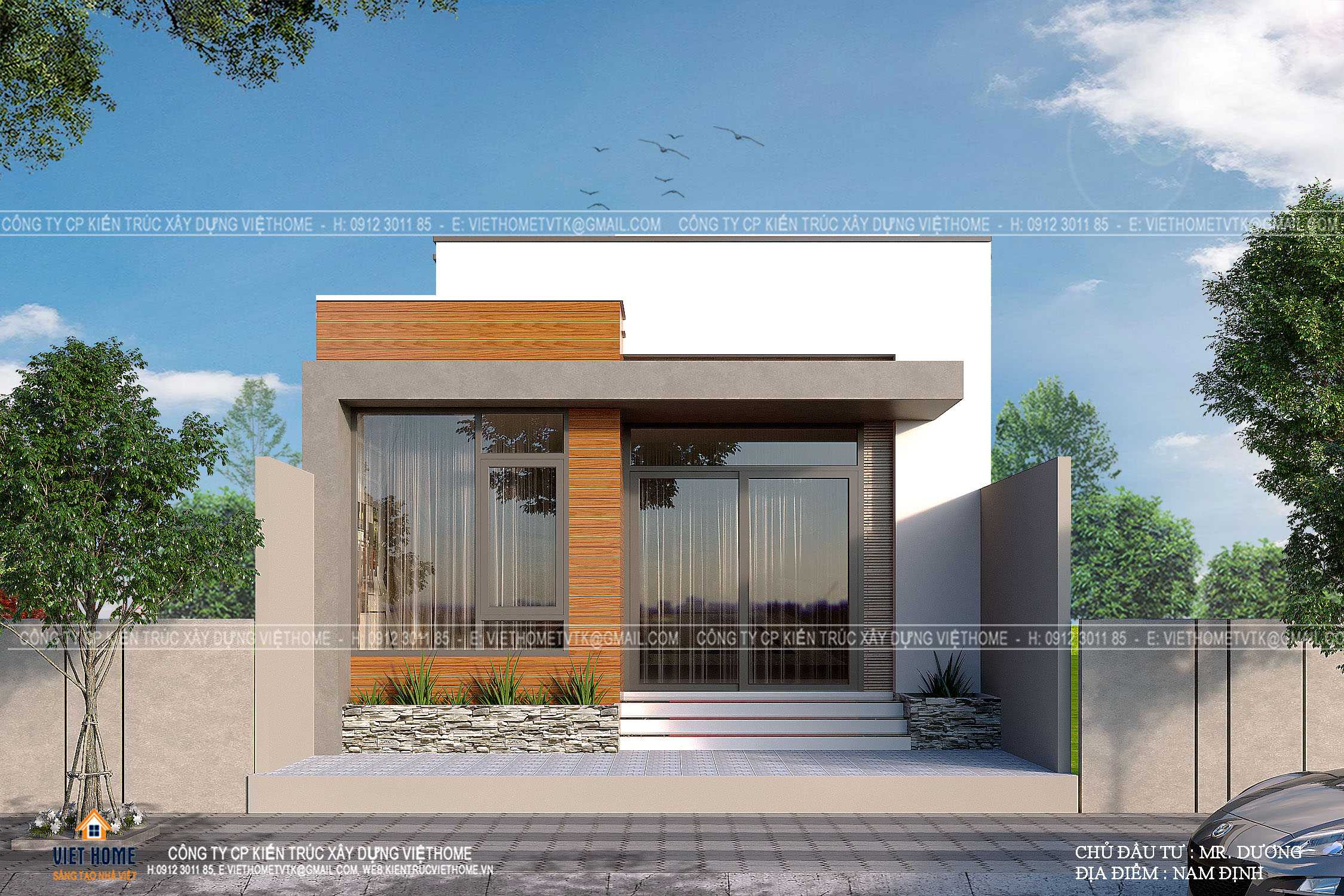 Nhà ống 1 tầng mái bằng chủ yếu được tạo từ những góc vuông và màu sắc trầm hơn. Cột nhà lát đá tạo điểm nhấn mạnh mẽ cho cả ngôi nhà.