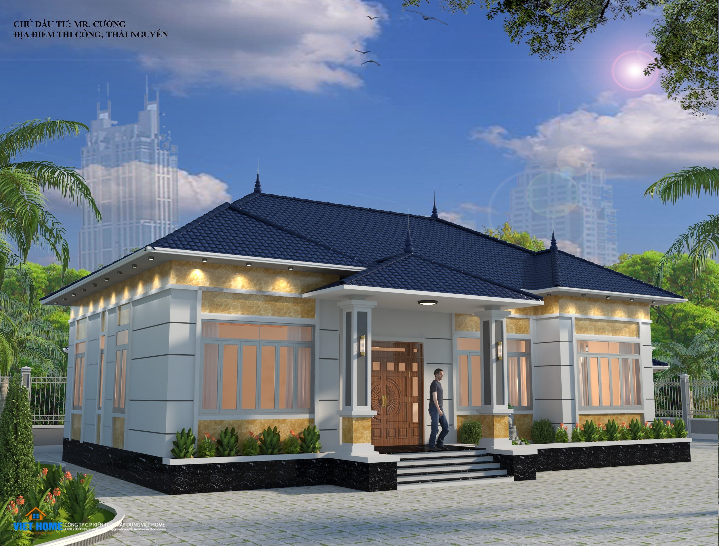 Nếu bạn đang mong muốn xây dựng một căn biệt thự 1 tầng đẹp có thể tham khảo mẫu thiết kế dưới đây. Đây là một ngôi biệt thự 1 tầng 4 phòng ngủ ở Thái Nguyên. Mong muốn của chủ nhà là một không gian nhà ở rộng rãi, nằm ở mảnh đất vườn rộng rãi, thoáng mát . Kiến trúc Việt Home đã thiết kế theo mong muốn sở hữu một không gian sống rộng rãi, thoải mái và tiện nghi của chủ nhà. Ý tưởng thiết kế ngôi nhà biệt thự vườn, với 4 mặt tiếp giáp với thiên nhiên, cộng với các không gian bao quanh như sân, vườn, cổng, hàng rào…. được rất nhiều gia đình mong muốn và lựa chọn xây dựng.