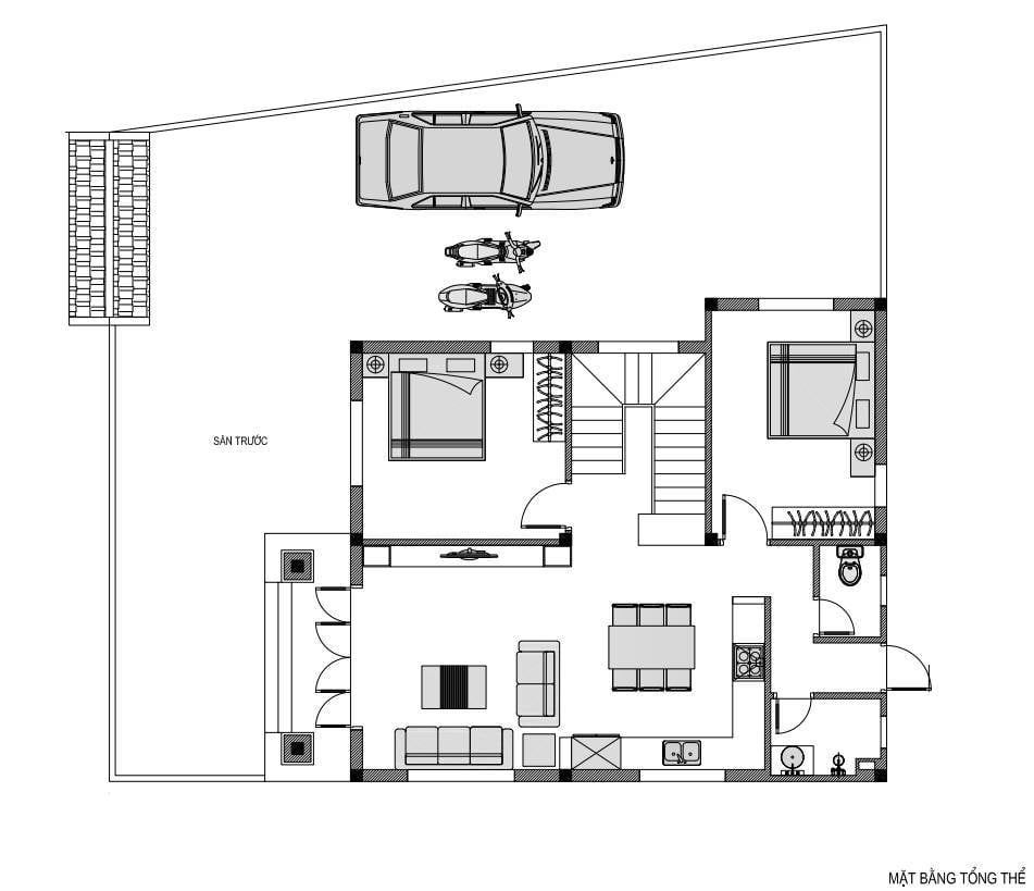 + Tầng 1: Phòng khách + Bếp ăn + 2 Phòng ngủ + WC