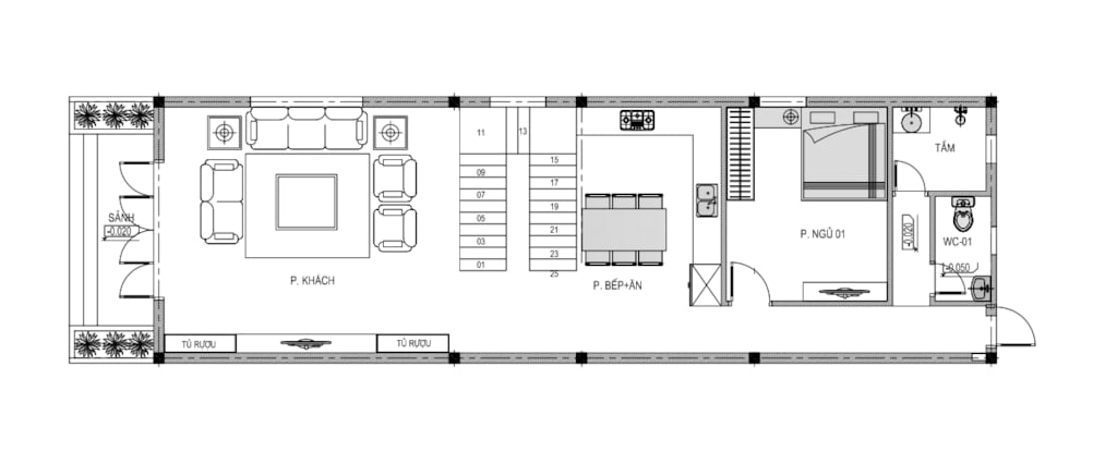 + Tầng 1: Phòng khách + Phòng bếp + 1 Phòng ngủ + wc