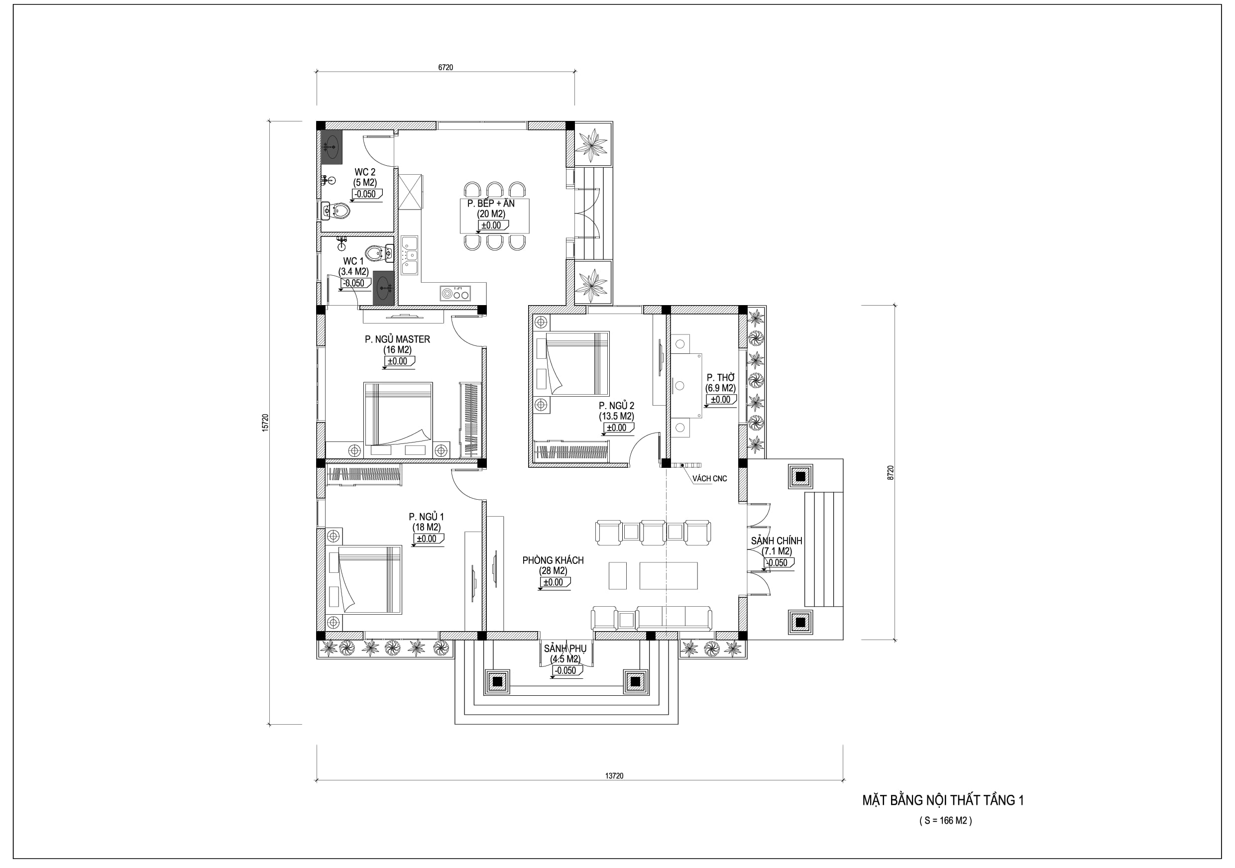 Phòng khách + Phòng thờ + Bếp + 3 Phòng ngủ + 2 WC