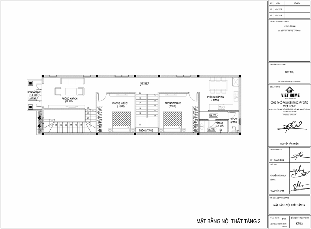 + Tầng 2: Phòng khách+ bếp ăn + 02 nhà vệ sinh + 02 phòng ngủ