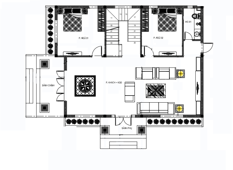 + Tầng 1: Phòng khách + KGĐ, 2 phòng ngủ, 1 WC.