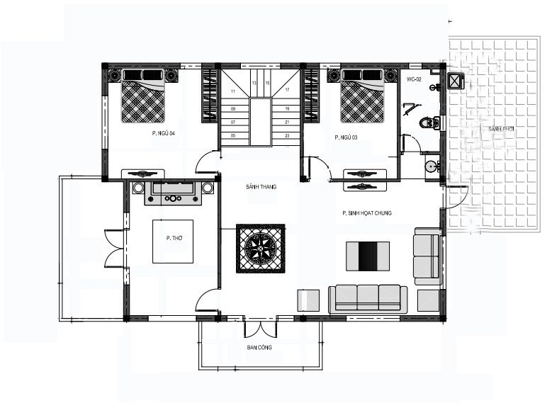 Tầng 2: Phòng sinh hoạt chung, phòng thờ, 2 phòng ngủ, 1 WC, Sân phơi.